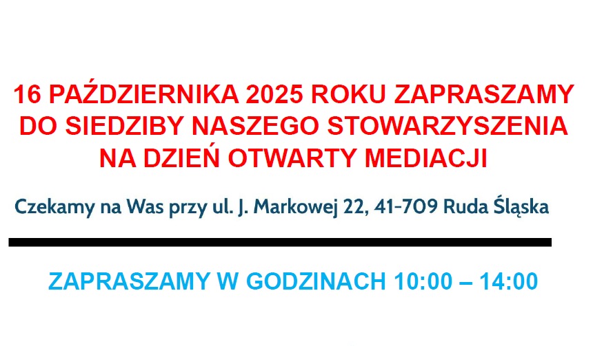 - Zaproszenie na Dzień Otwarty Mediacji16 października 2025 roku zapraszamy do siedziby naszego stowarzyszenia na Dzień Otwarty Mediacji.