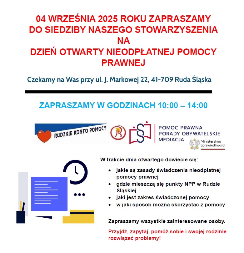 - Dzień Otwarty Poradnictwa PrawnegoW dniu 4 czerwca br. Rudzkie Konto Pomocy organizuje Dzień Otwarty Poradnictwa Prawnego w siedzibie stowarzyszenia w Nowym Bytomiu przy ul. J. Markowej 22, piętro 1, pokój nr 3.