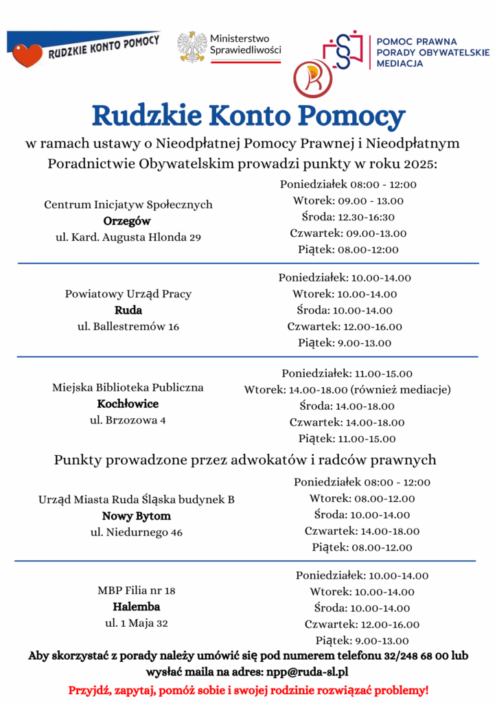 Ми також надаємо консультації російською та англійською мовами у безкоштовних громадських консультаціях та пунктах безкоштовної правової допомоги. Запрошуємо всіх, хто потребує допомоги! Надання безкоштовних юридичних консультацій та надання безкоштовних громадянських консультацій наразі відбувається в пункті, після попередньої реєстрації: - за телефоном 32/248 68 00, - особисто в Управління охорони здоров’я та соціальних питань Ратуші м. Руда Шльонська, к. 313, - надіславши електронного листа на адресу: npp@ruda-sl.pl (вказавши ім'я, прізвище та контактний номер - або через веб-сайт Мін'юсту: https://np.ms.gov.pl/%C5%9Bl.../m.%20Ruda%20%C5%9Al%C4%85ska